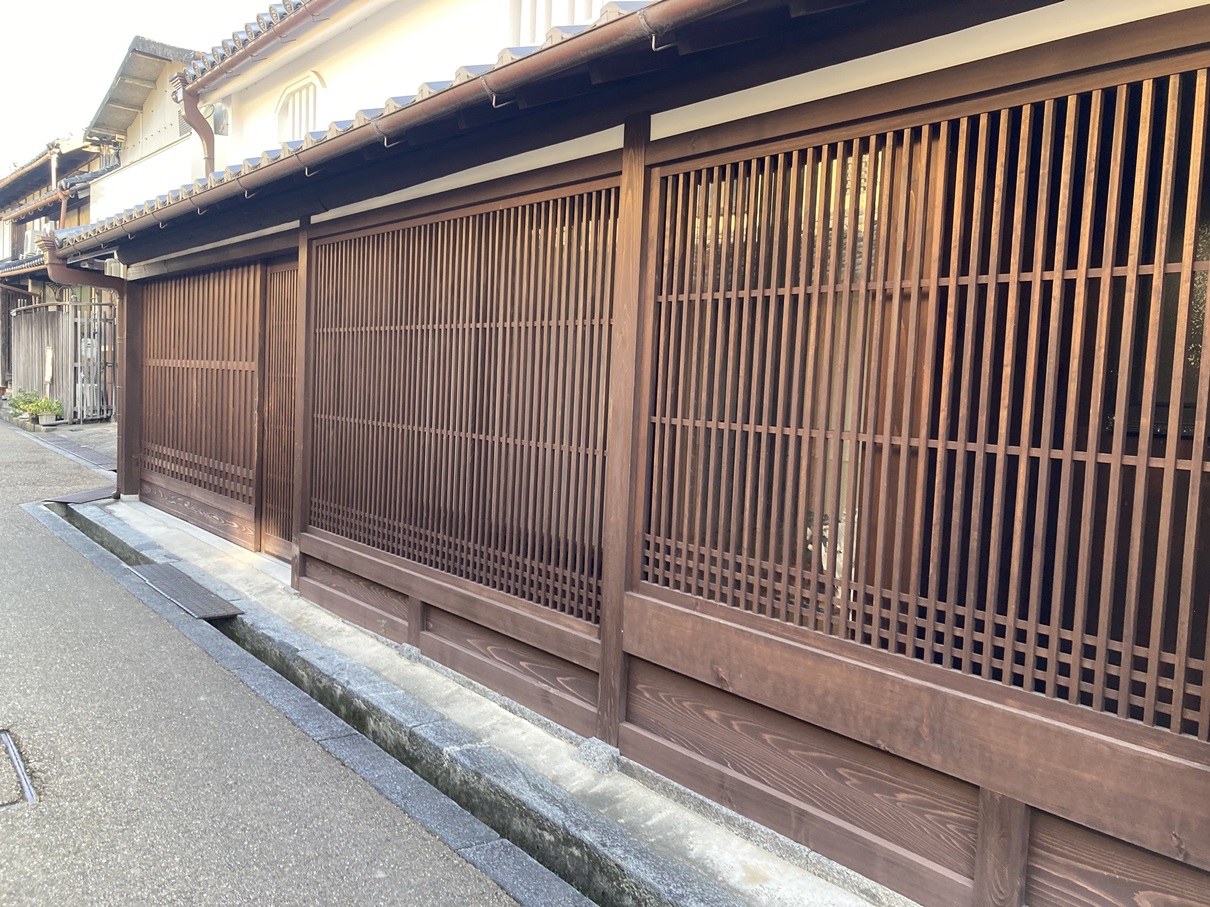 今井町には町並み保存を担当する役所機関があり、細やかな助言を受けています。配置計画、建物高さ、玄関戸の高さ、腰板の高さ、格子の間隔、格子の種類、仕上げ方法など、「今井町らしさ」を再現する寸法を具体的に教えていただきました。