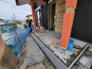 先日現場に行ったときは、玄関入り口ポーチの御影石張り工事の途中でした。