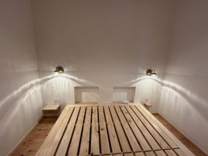 夕方の太陽の光はオレンジ色で低い位置から照らすので、寝室はそれにならいオレンジ色の電球色のライトを壁に設置する。