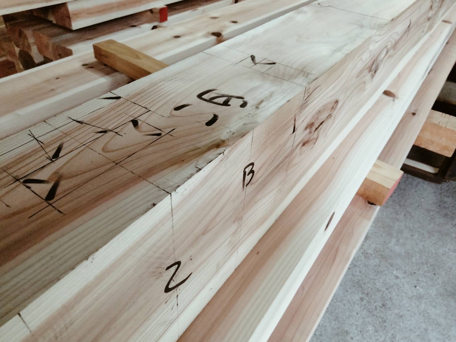 大工さんが加工場で新築の家の墨付けをしています。