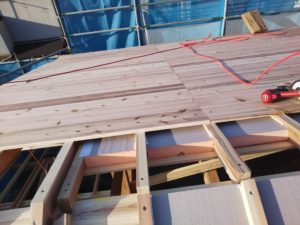 垂木に対して杉板を斜め45度の角度で貼っています。