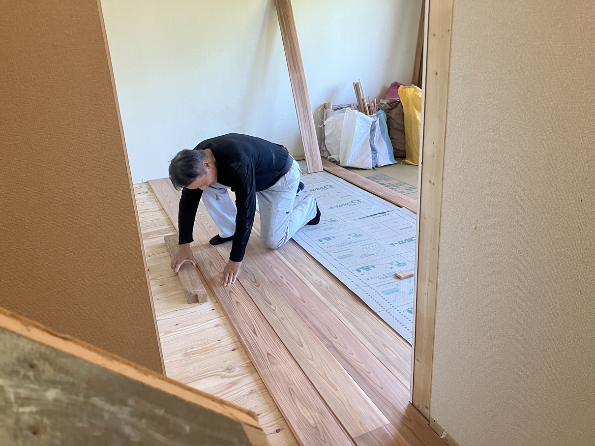 新しい無垢の床板はもともと貼られていた床板の上に増張りという方法で施工します。2階は厚み15ミリの杉床板を貼りました。その他カーペットだったところやCFシートが貼られていたところも、下地の高さを調整して仕上がりがフラットになるように床板を張っていきます。階段と1階は同じく15ミリの厚みで、こちらは桧を張ります。
