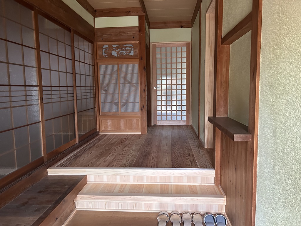 キッチンやトイレなどの住宅設備を入れ替え、畳をフロア材に張替をしたり、居室となる2階の天井高さをかえたり、窓は断熱性の高い窓に入れ替えたり、防犯性なども考慮して、玄関戸も取替させていただきました。これまでの玄関戸も大切にほかの場所で再活用しております。勝手口の段差のあるところには、安全に配慮して手すりも新設しました。