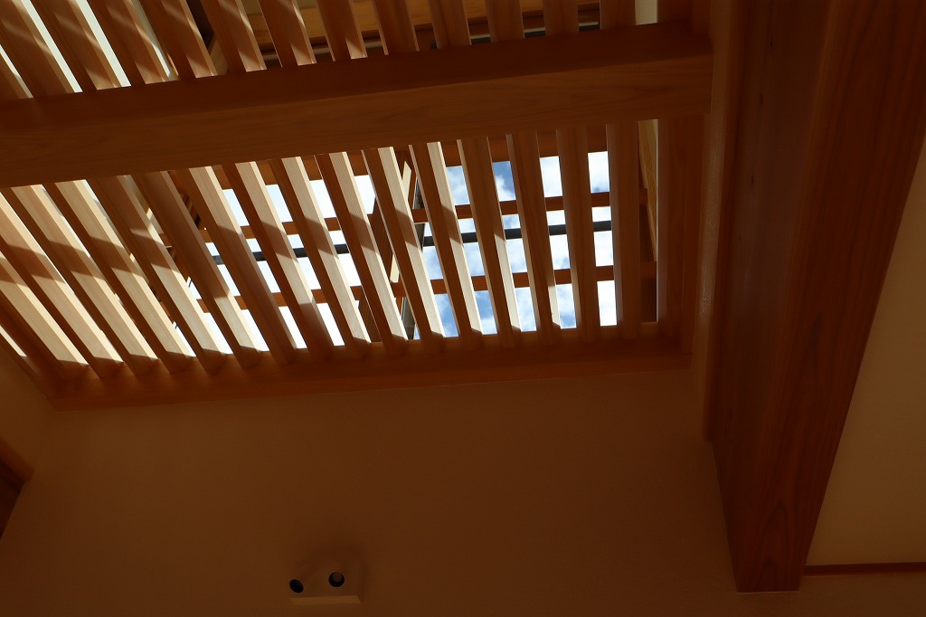 モデルハウスにもある、格子の吹抜けを覗くと空が見え、青空の中、雲が流れているのもまた見ていて癒されます。