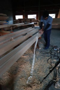 鉋を使って柱を仕上げています。
