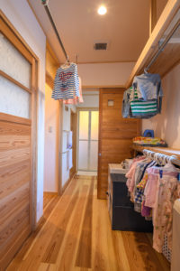 帰ってきて、手洗いをするといった動線上に着替え兼収納の部屋があり、また衣服を脱いだものを脱衣室にすぐに持っていけます。