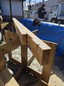 この見学会でご案内するのは、壁や床で隠される前の木造住宅の構造部分。