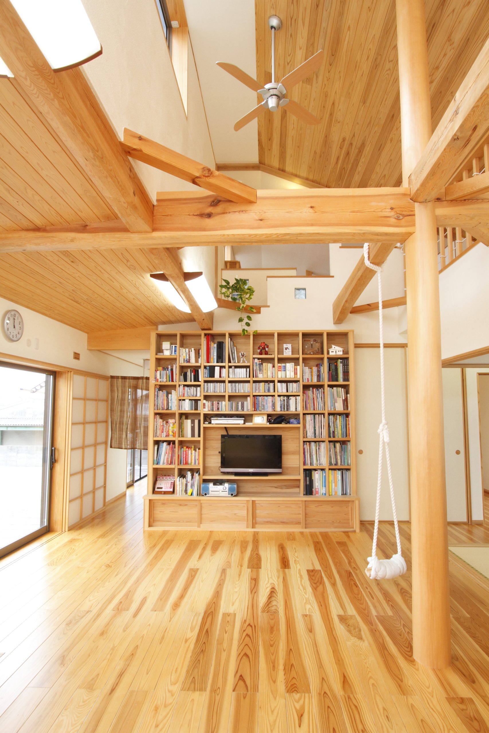 構造計算された木組みが風格を与える吹き抜けを持つLDK