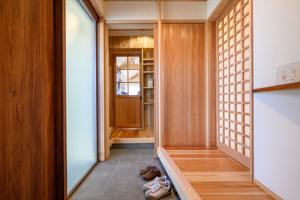 玄関部と洗面スペースの間仕切りには、こちらの敷地にもともと建っていた古家の欄間を再利用。