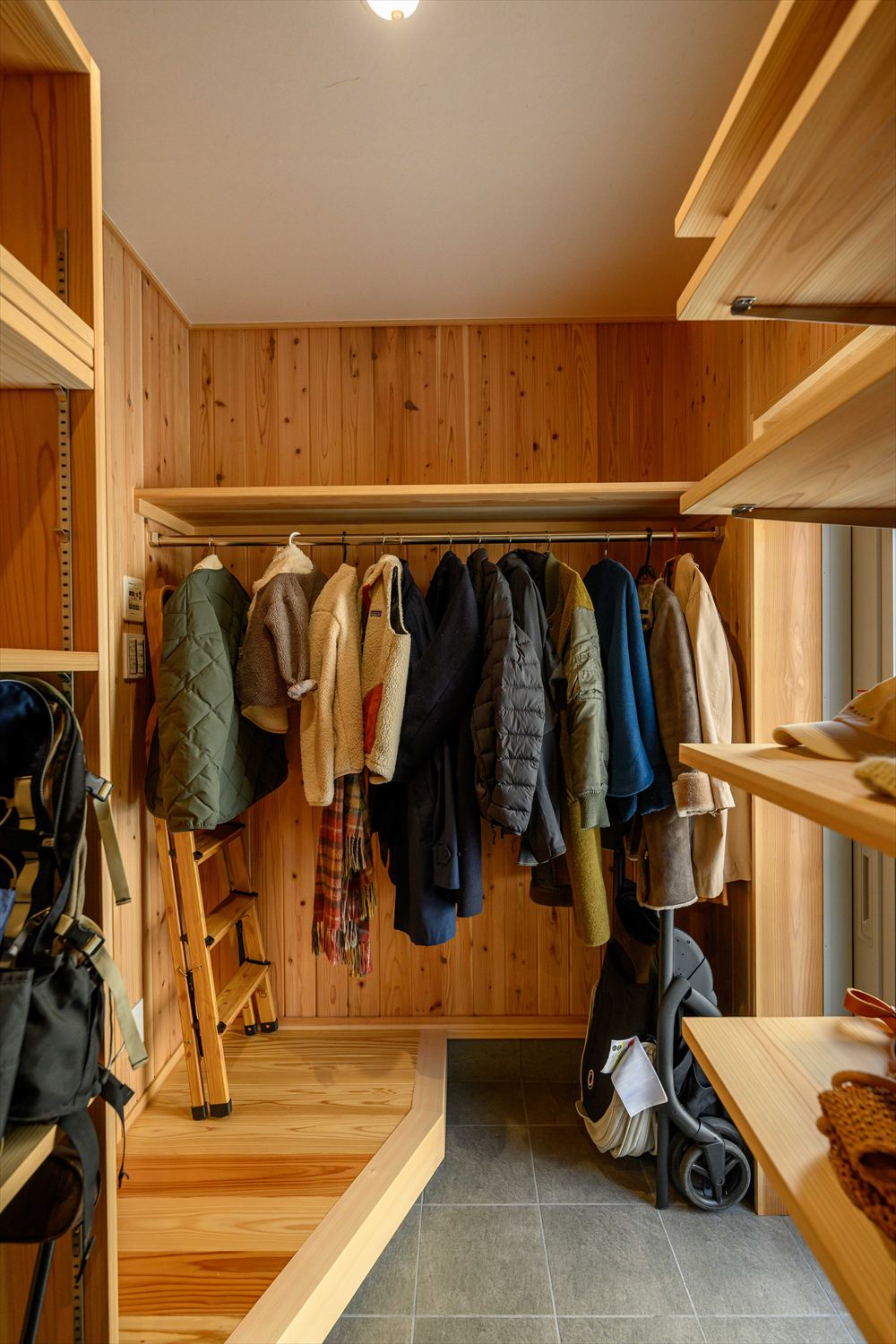 右側には花粉症をお持ちのS様のご要望で、靴だけでなく上着やカバンなどを収納できるファミリークローゼットに直結しています。