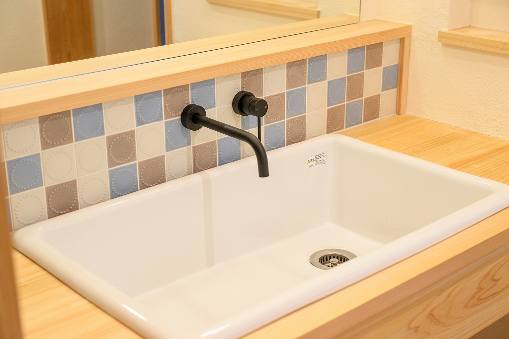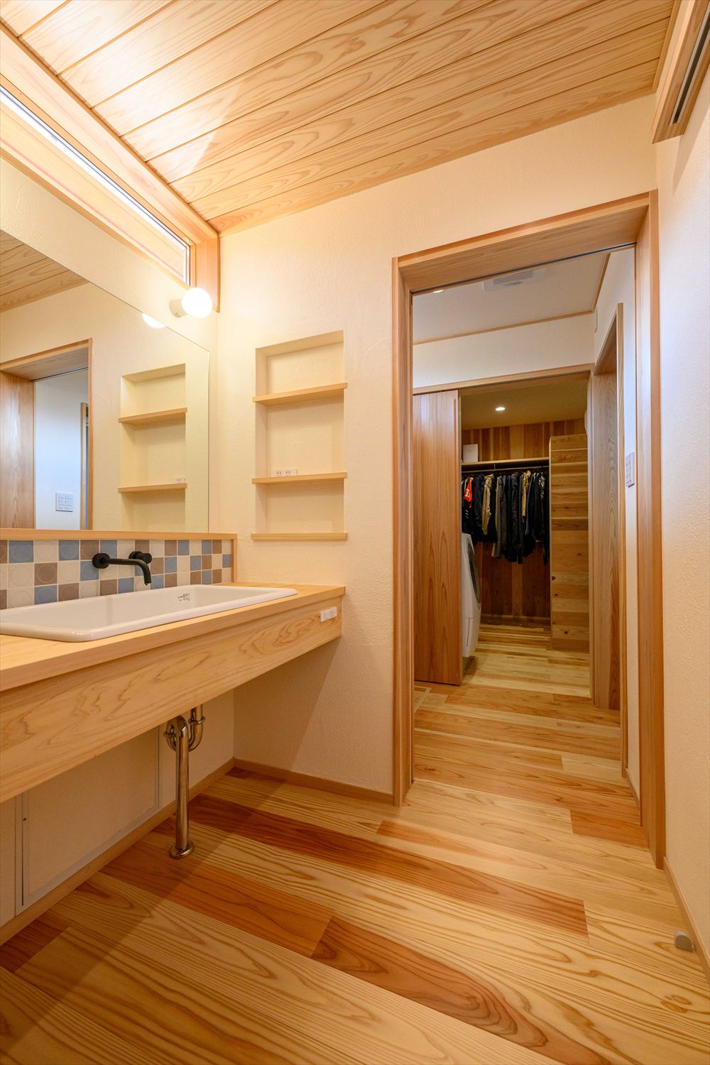 造作の化粧台を設置した洗面スペースは、帰宅後すぐに手洗いができるよう玄関部の間近にレイアウト。