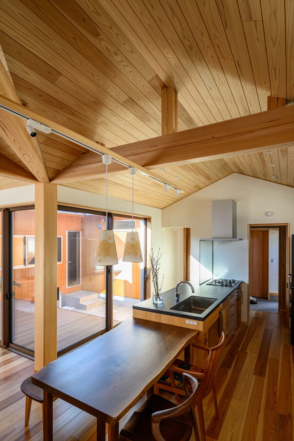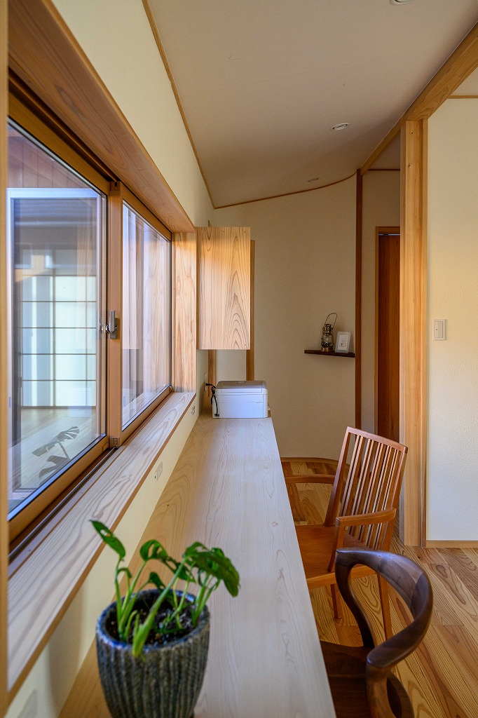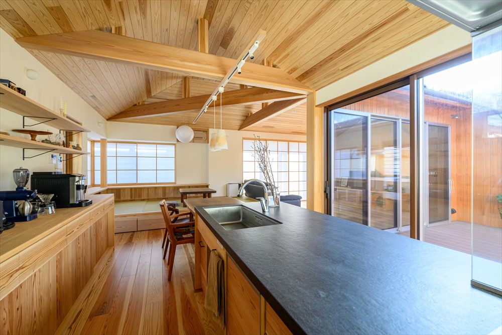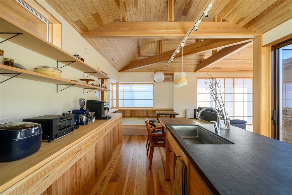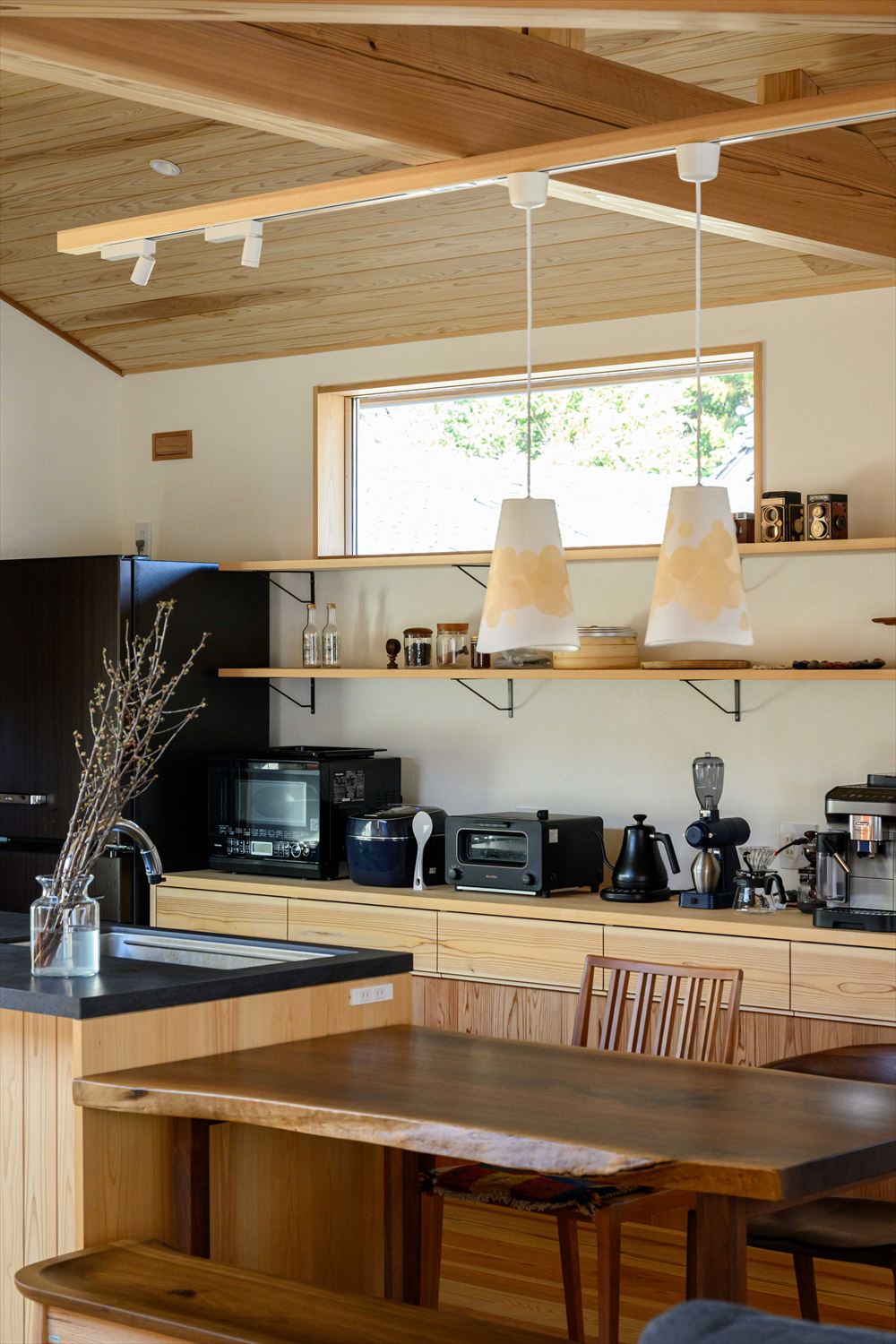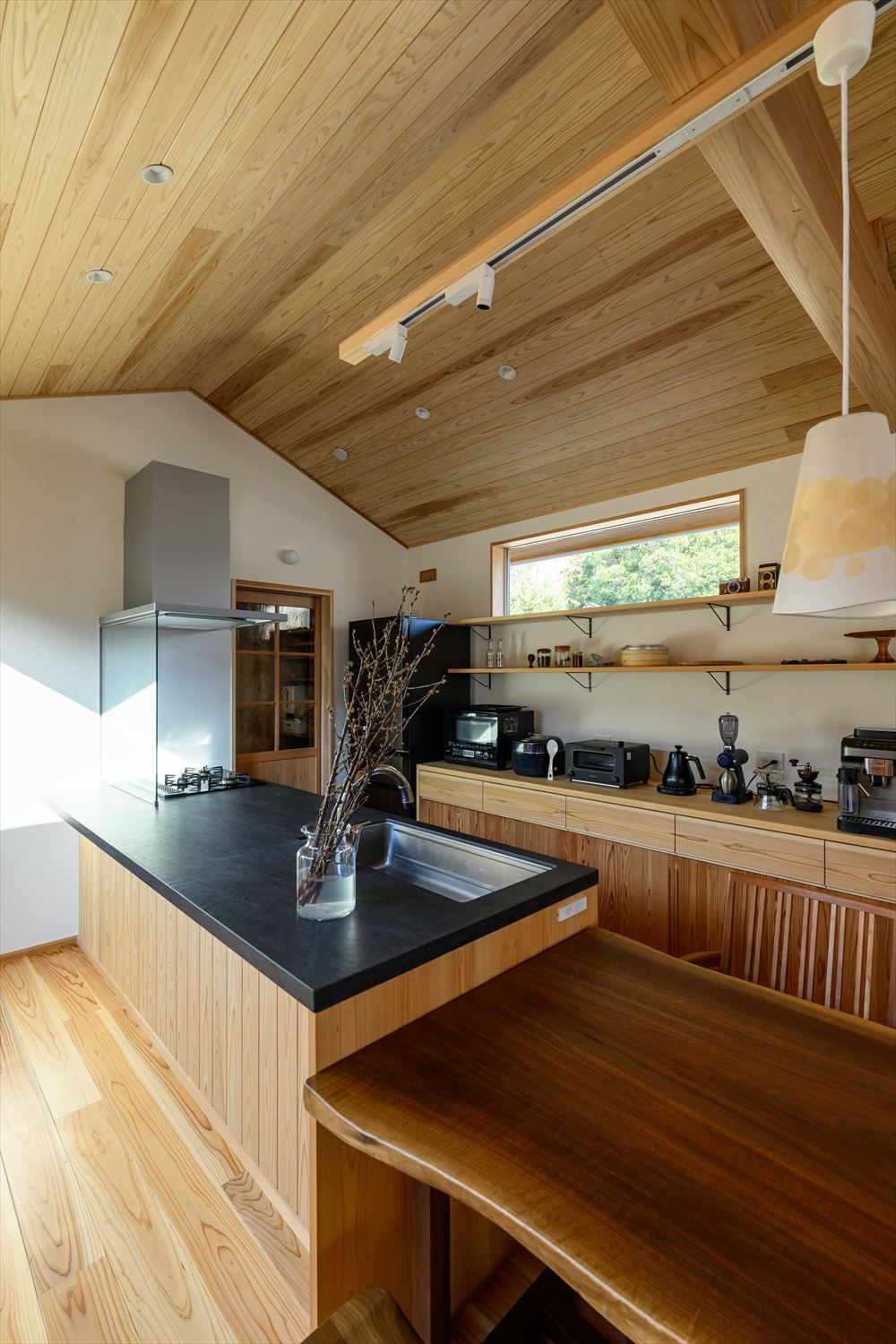 「キッチンは広々と使いたい」というご夫婦のリクエストに応えた造作のキッチンは、桧や杉を用いて制作しました。