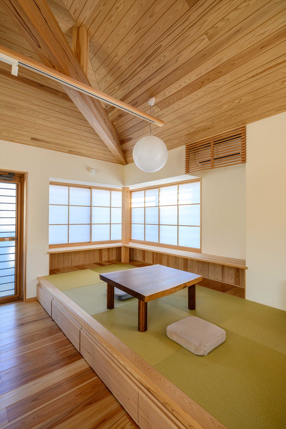 LDK の一角は、下部が引き出し収納になった小上がりの畳スペースに。