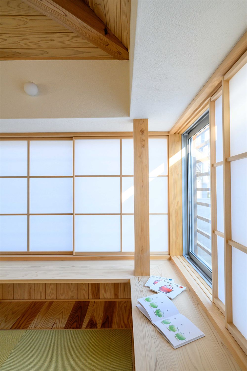 リビングは道路側の窓は障子でプライバシーに配慮しつつ明るさと風通しに考慮しています。