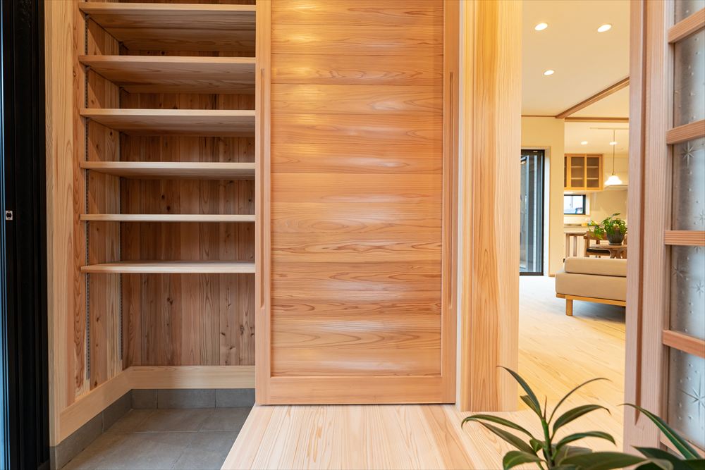 住宅の顔である玄関空間には無垢の木を使用したオリジナルの建具と収納棚が。