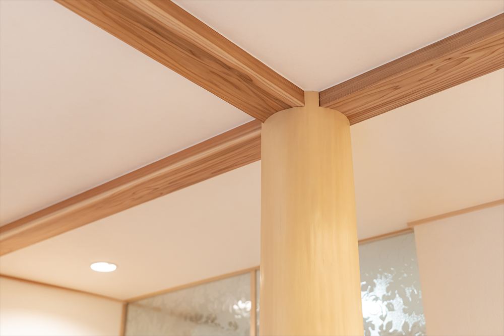 丸太の大黒柱から伸びる梁からは職人さんの技を感じることができます。
