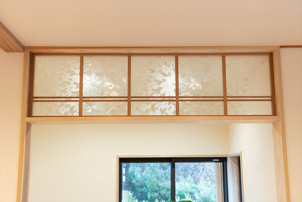 上部にあしらわれたた昭和ガラスは、空間を緩やかに区切りながら光を通し、生活空間のかわいらしいアクセントに。