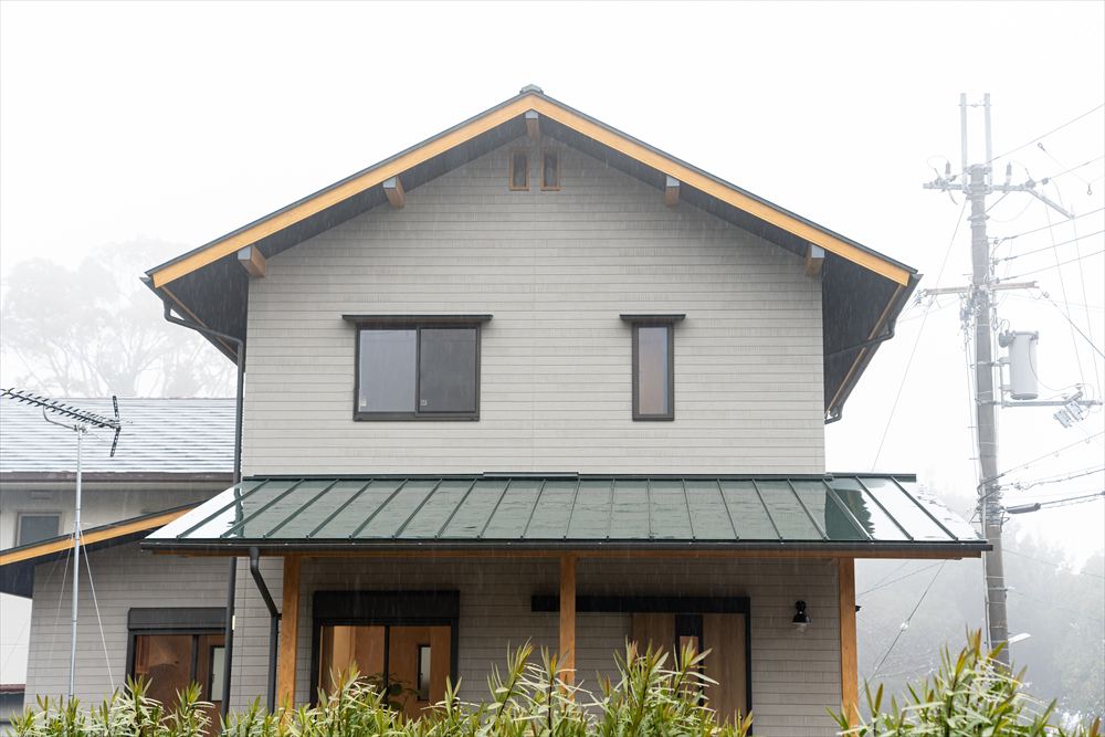 外観はすらっと落ち着きのある佇まいに。ご主人の希望である、深い軒も実現。軒天は木の板張りで仕上げました。