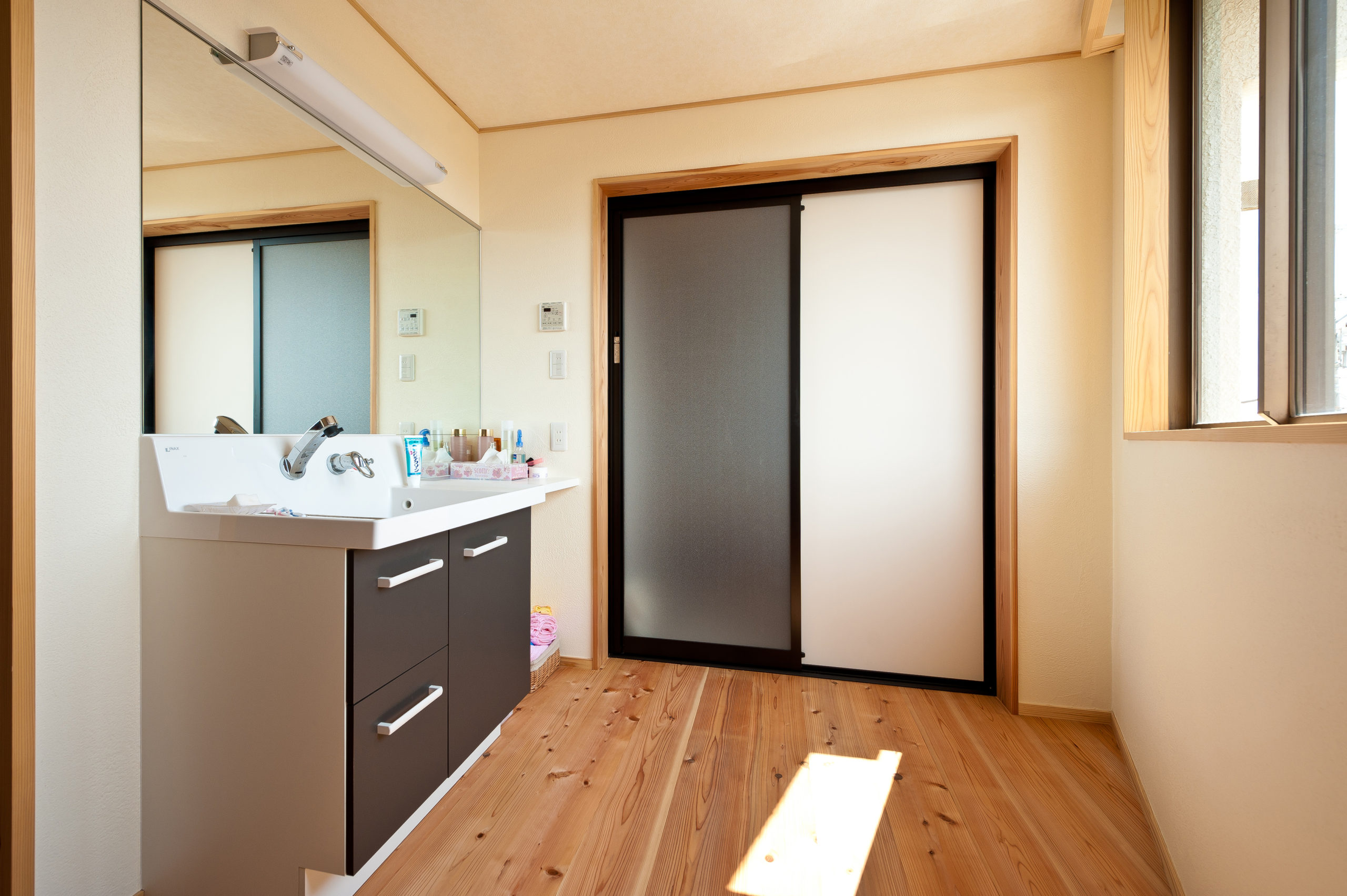 化粧コーナー・洗濯コーナー・収納・給湯器と多彩な用途をすっきりとまとめています。