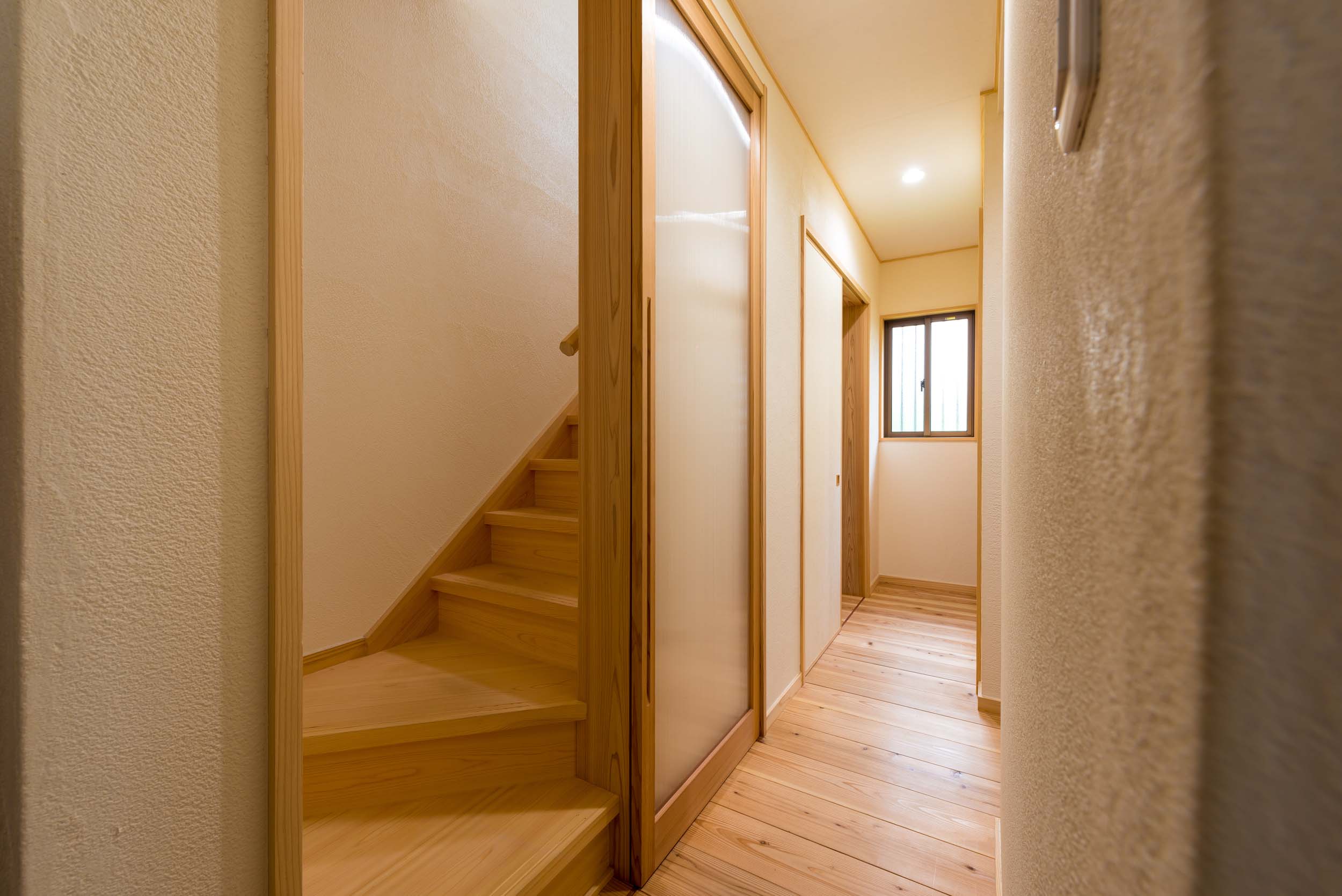 桧のリビング階段の上り口には冬場の暖房効率を上げるため、壁いっぱいの大きな建具を入れました。