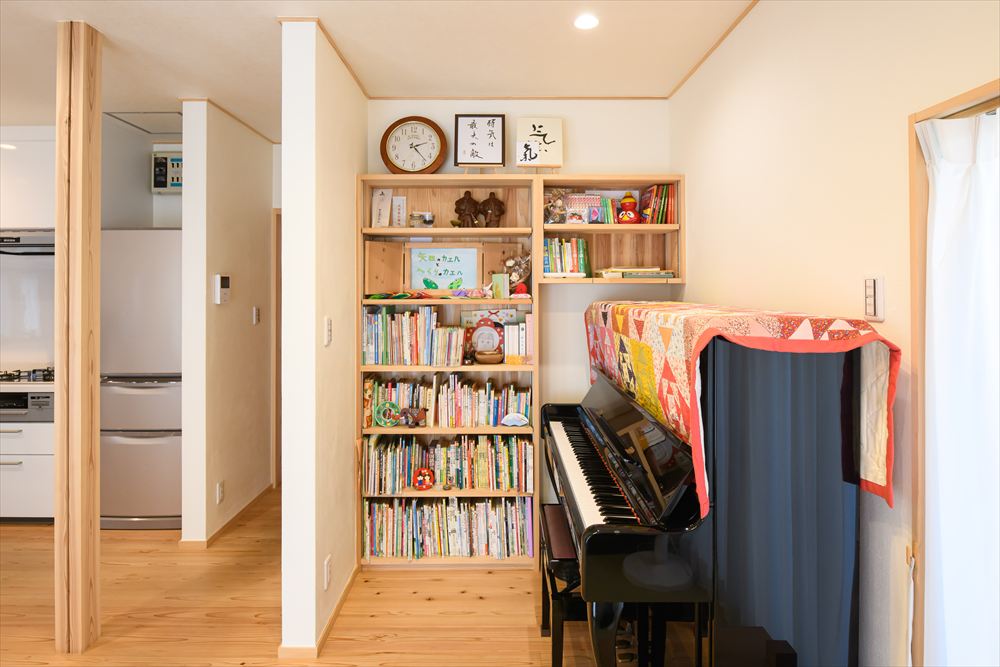 ピアノコーナーにはスペースに合わせて設計したオリジナルの本棚があります。稼働棚となっており、入れる本のサイズに合わせて棚板の高さ調整が可能です。