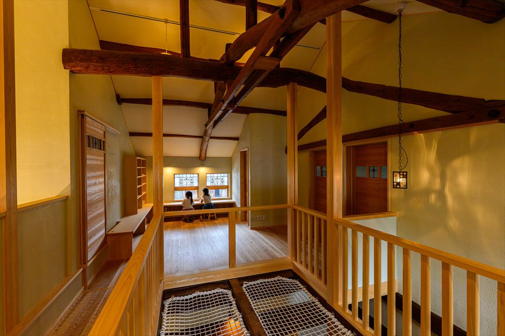 リビング上部にあたる吹き抜けには光と風を通す格子床が。手すりには再利用の欄間をはめ込みアクセントに。