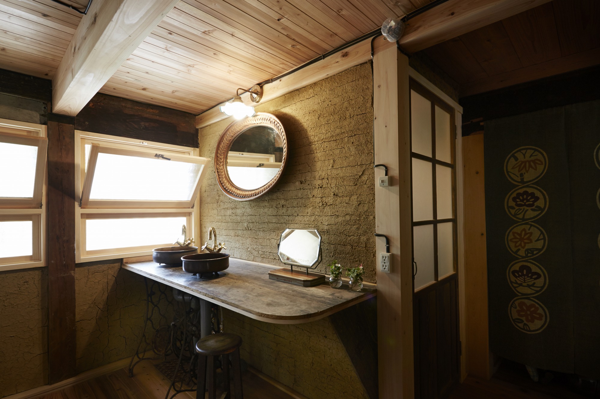 洗面ボウルや鏡はレトロ雑貨がお好きな奥様が集められたものを設置しました。
