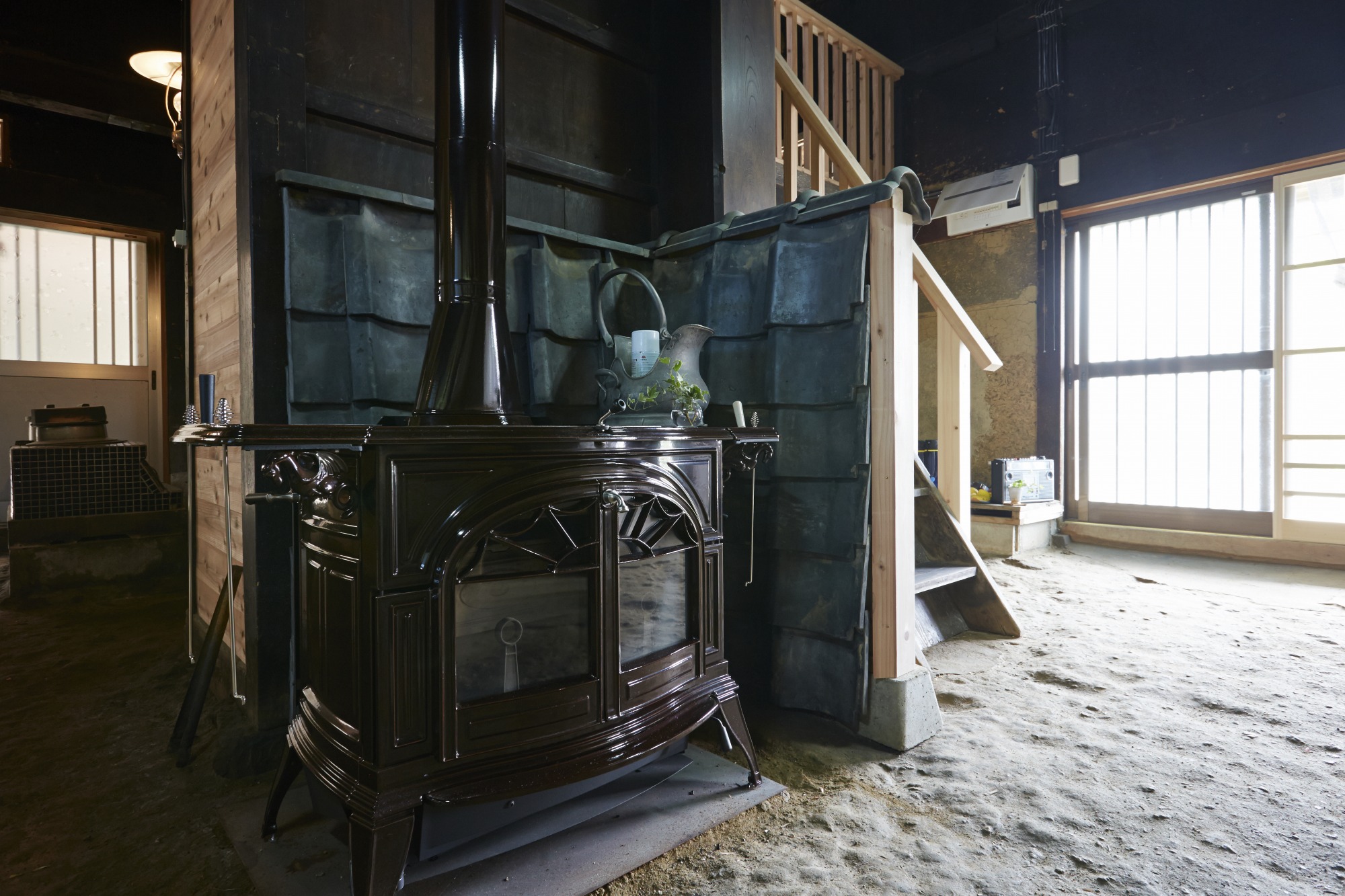 薪ストーブを囲う遮熱板はリフォーム前にこの家に使われていた瓦を再利用しました。