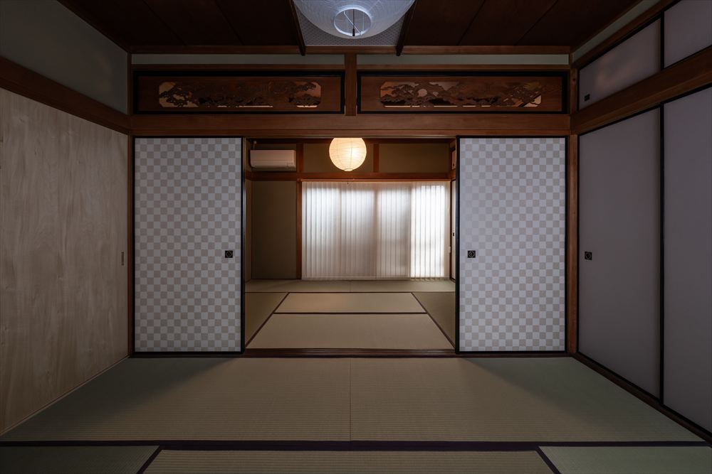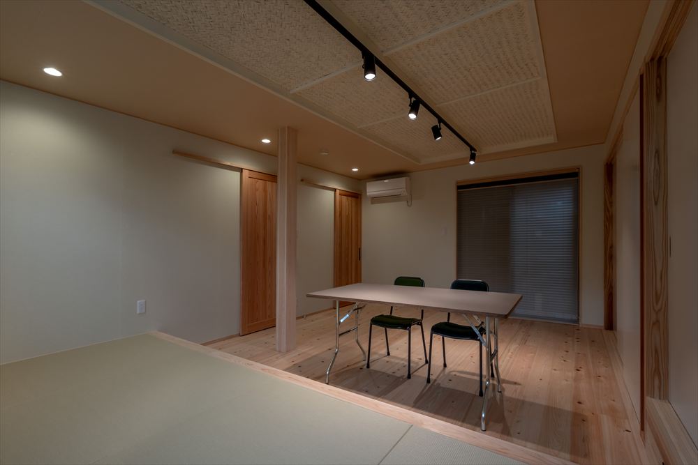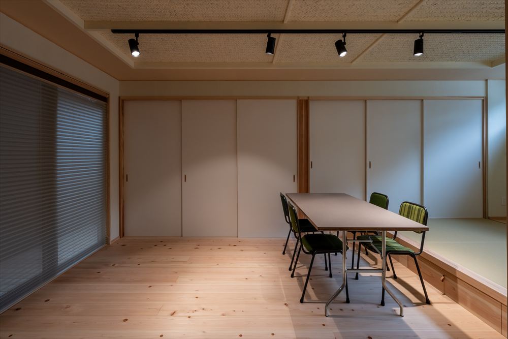 二階は和室をメインとした空間に。不特定多数の方が使うゲストハウスにおいて、障子の代わりにブラインドカーテンを採用することで、破れてしまうリスクを回避しつつ、障子のような柔らかい拡散光を室内に取り入れます。